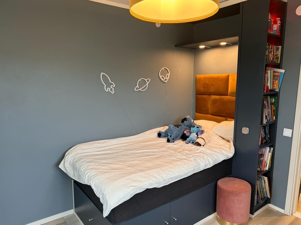 Our house is 129 square meters with 3 bedrooms ( one double bed and 2 children's room).