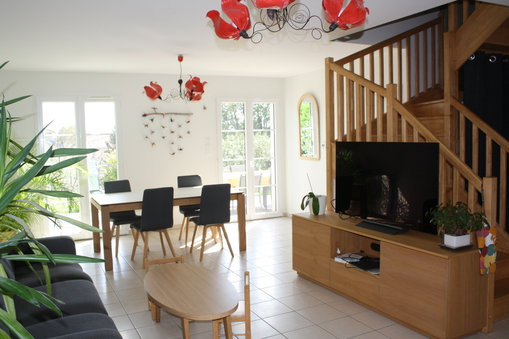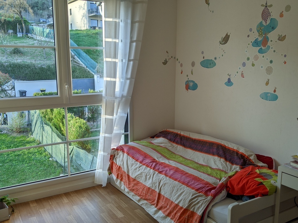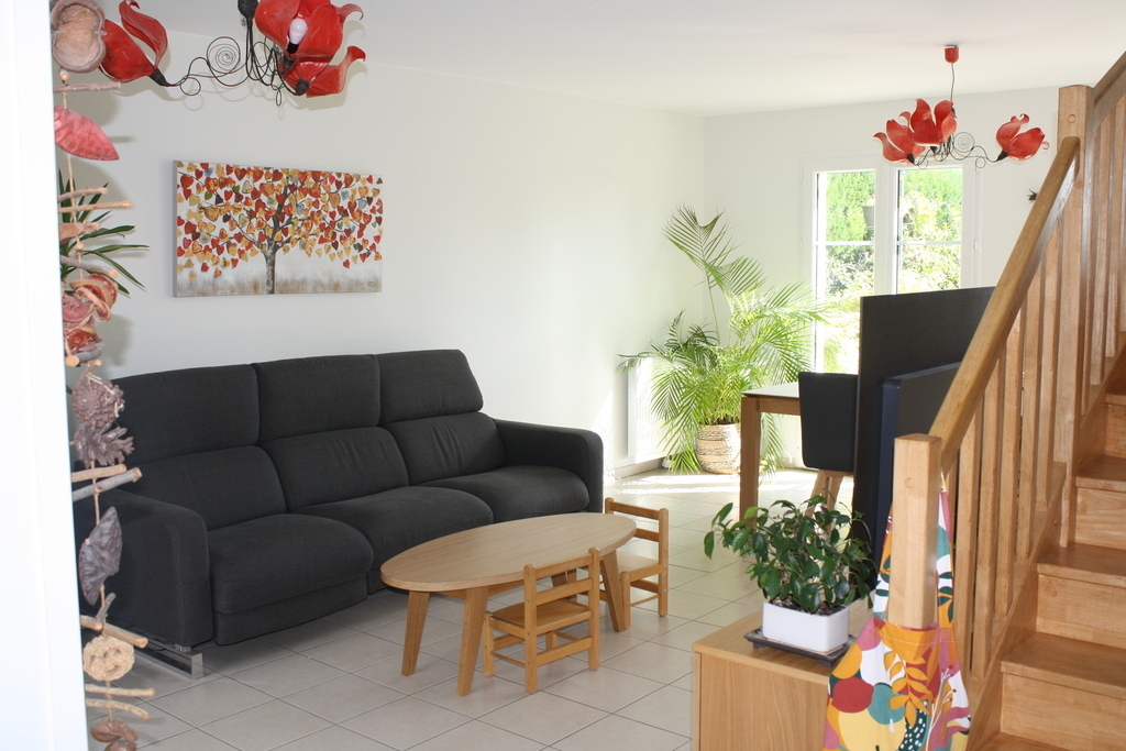 Our house is located in a quiet cul-de-sac, on the “Côtière”, a hill offering a beautiful view of the surrounding countryside. Spacious, bright and comfortable, it features an enclosed garden planted with trees. The house comprises a living/dining room, fitted kitchen, 2 bathrooms, 2 wc, 4 bedrooms (1 master suite, 1 bedroom with a single bed, 1 with a sofa bed and 1 with a cot) and a laundry room. A wifi connection is available.