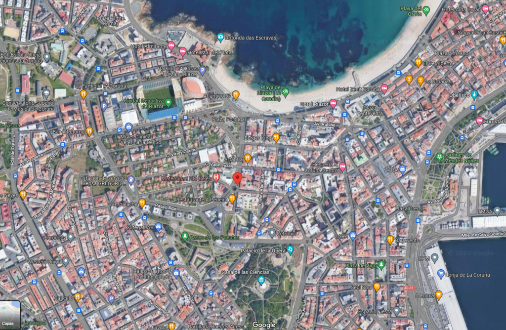 Se trata de una zona muy tranquila a diez minutos andando al centro de Coruña, donde puede disfrutar de los Cantones, la Calle Real y el Ayuntamiento entre otros destinos turísticos. Otros puntos de interés como el Palacio de la Ópera, el Parque de Sta. Margarita se encuentran a cinco minutos andando. La playa de Riazor y el paseo marítimo se encuentra a tan solo un minuto de distancia del apartamento. La buena situación de la vivienda permite andar por la ciudad sin necesidad de coche, aunque hay un buen servicio de Buses que permite desplazarse por ciudad y alrededores.